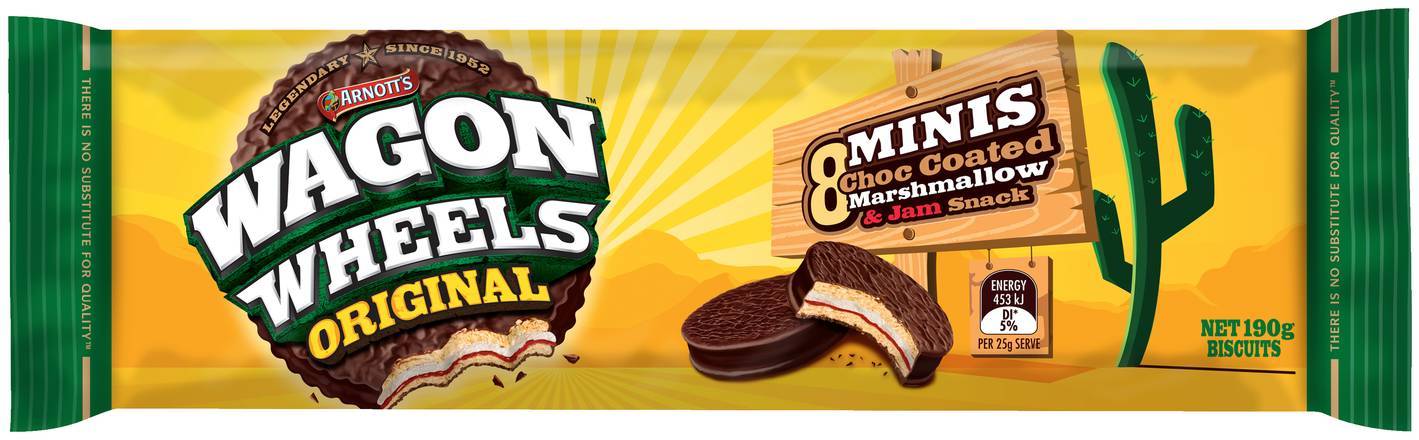 Arnott's Wagon Wheels Minis Tray is a fun-sized version of the classic Wagon Wheels biscuit treat, featuring a crunchy biscuit base, a creamy marshmallow center, and a delicious chocolate coating. Perfectly portioned for sharing or enjoying as a quick snack, these mini Wagon Wheels are a nostalgic favorite for both kids and adults. Conveniently packaged in a tray for easy serving, they offer the same great taste as the original, but in a bite-sized form.