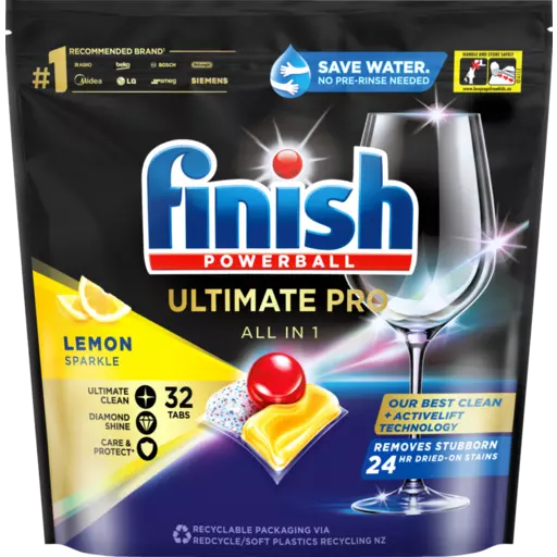 For ultimate dishwashing performance, trust Finish Ultimate Pro Dishwashing Tablets Lemon Sparkle 32 Pack to deliver spotless, streak-free, and sparkling results with every wash!