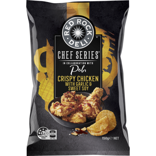 Indulge in the bold, savory, and aromatic taste of Red Rock Deli Chef Series Crispy Chicken with Garlic & Sweet Soy Potato Chips Share Pack 150g, where every bite brings a delightful crunch and an explosion of gourmet flavors!