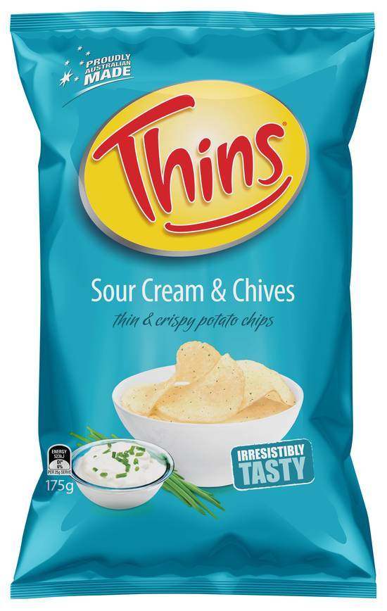 Thins Sour Cream & Chives 175g is a popular Australian snack known for its light and crispy texture, offering a delightful blend of sour cream and chives flavors.