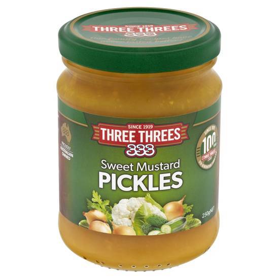 Three Threes Mustard Pickles 250G is a classic, flavorful condiment made from a traditional recipe that combines finely chopped vegetables with a tangy mustard sauce. This deliciously smooth and slightly chunky pickle blend delivers a perfect balance of sweetness and tanginess, enhanced by the rich, zesty taste of mustard.