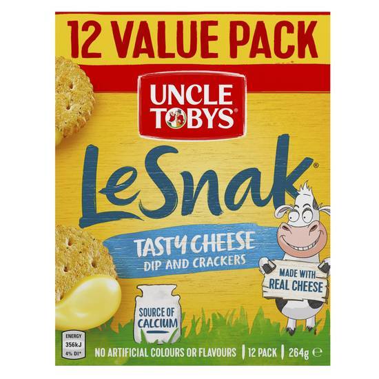 Uncle Tobys Le Snak Tasty Cheese Dip & Crackers offer a convenient and delicious snack option, combining real cheese with crunchy crackers. This 12-pack provides individually portioned servings, making it ideal for lunchboxes, on-the-go snacking, or family outings. Each serving is a good source of calcium, contributing to your daily nutritional needs.